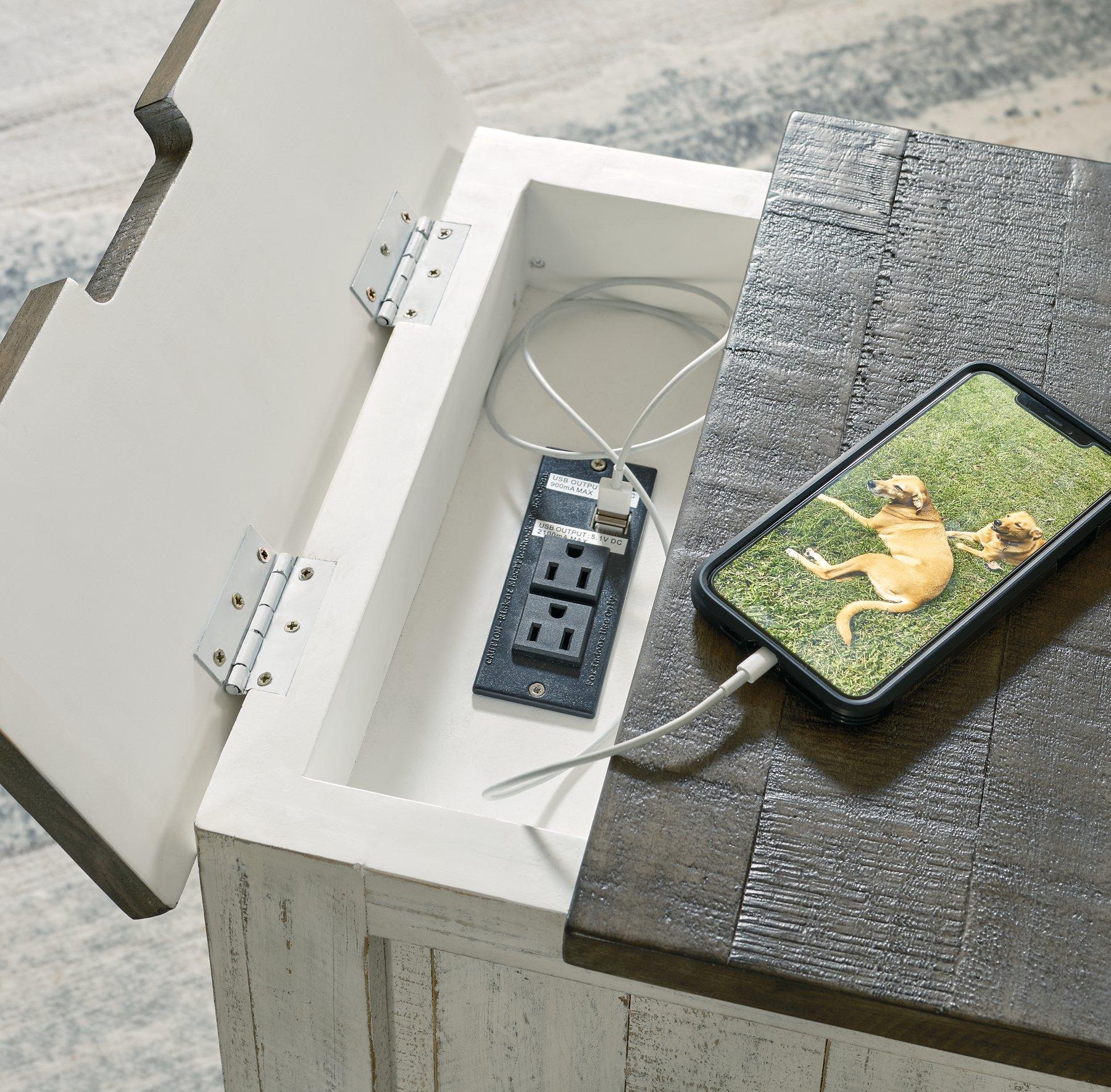 What a fresh interpretation of country classic style. Inspired by American farmhouse craftsmanship, but with an elevated sensibility, this chairside end table blends distinctive details such as turned post accents and raised door fronts for a substantial look that feels right at home. Those who appreciate rustic character should take note of the table’s thick crown moulding, beautified with a vintage two-tone finish. A small flip lid located on the top conceals a power outlet and USB ports to keep electronics charged up and close at hand