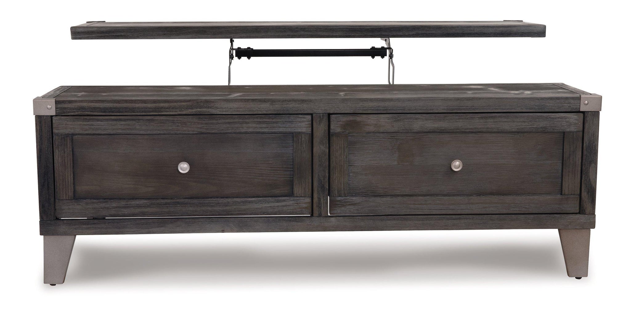 Mixed material lift top table truly elevates rustic-industrial style. Weather-washed pine wood and veneers are contrasted with canted metal legs and corner bracket accents for a uniquely chic merger of earthy beauty and contemporary flair. A handy spring-loaded mechanism brings the tabletop to you, while two drawers with removable storage trays are packed with possibilities.
