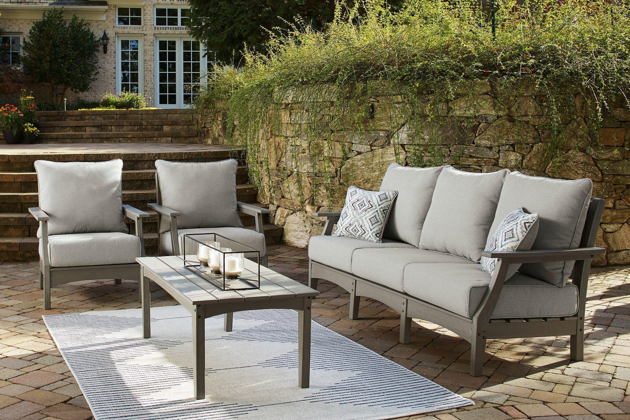 It’s the dawn of a new day for gray. Embrace the style trend with this outdoor conversation set. Each piece is crafted of HDPE material, combining the exceptional durability and weather resistance you need with the ‚wood look‚ you love. The coffee table and comfortably cushioned seats take alfresco living to a whole new level. A slatted table top infuses a plank-style, farmhouse-inspired touch and naturally sheds rainwater. Rest assured, the thick cushions on the sofa and lounge chairs are wrapped in Nuvella® high-performance fabric that’s fade-resistant, stain-resistant and a breeze to keep clean.